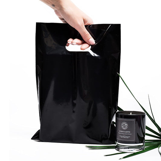 100 Black Bags for Small Business 1.5Mil 9"x12" Merchandise Bags Extra Thick Glossy Black Plastic Bags Thank You Bags and Black Retail Bags Plastic Bags For Small Business with Die Cut Handles