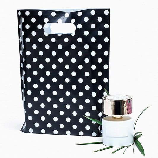 100 Black Polka Dots Bags for Small Business 1.5Mil 9"x12" Merchandise Bags Extra Thick Glossy Thank You Bags and Retail Bags Plastic Bags with Die Cut Handles Black Polka Dots Bags